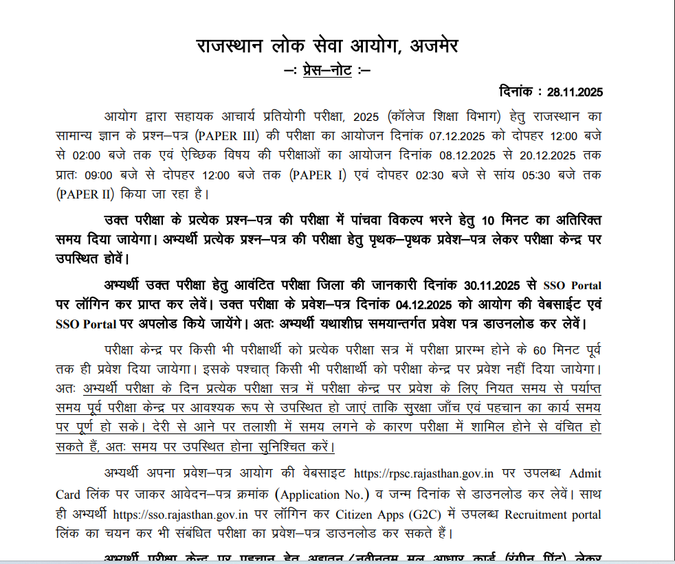 Rajasthan Public Service Commission (RPSC) ने Assistant Professor (College Education Department) Recruitment 2025 के लिए Admit Card जारी कर दिया है। साथ ही विस्तृत परीक्षा समय-सारणी, रिपोर्टिंग नियम, दस्तावेज़ और पूरी भर्ती विवरण भी अपडेट कर दिए गए हैं। नीचे आपको भर्ती + एडमिट कार्ड + परीक्षा — सबकी एक जगह पूरी और विस्तृत जानकारी […]
