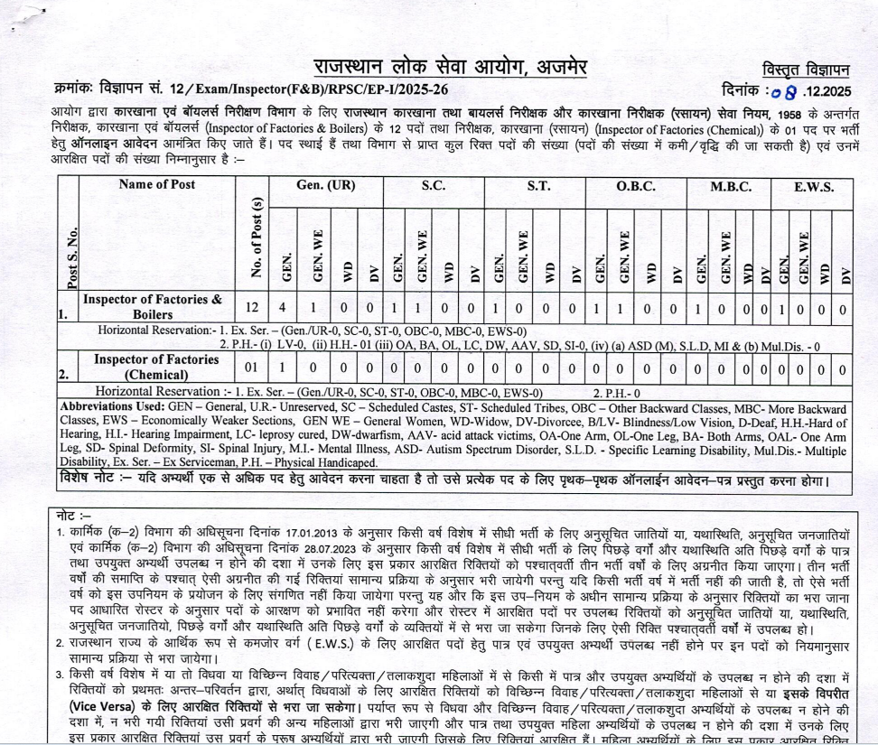 - कम से कम 2 वर्ष का अनुभव फैक्ट्री, बॉयलर, औद्योगिक सुरक्षा या निरीक्षण से जुड़े तकनीकी काम में अनिवार्य है।