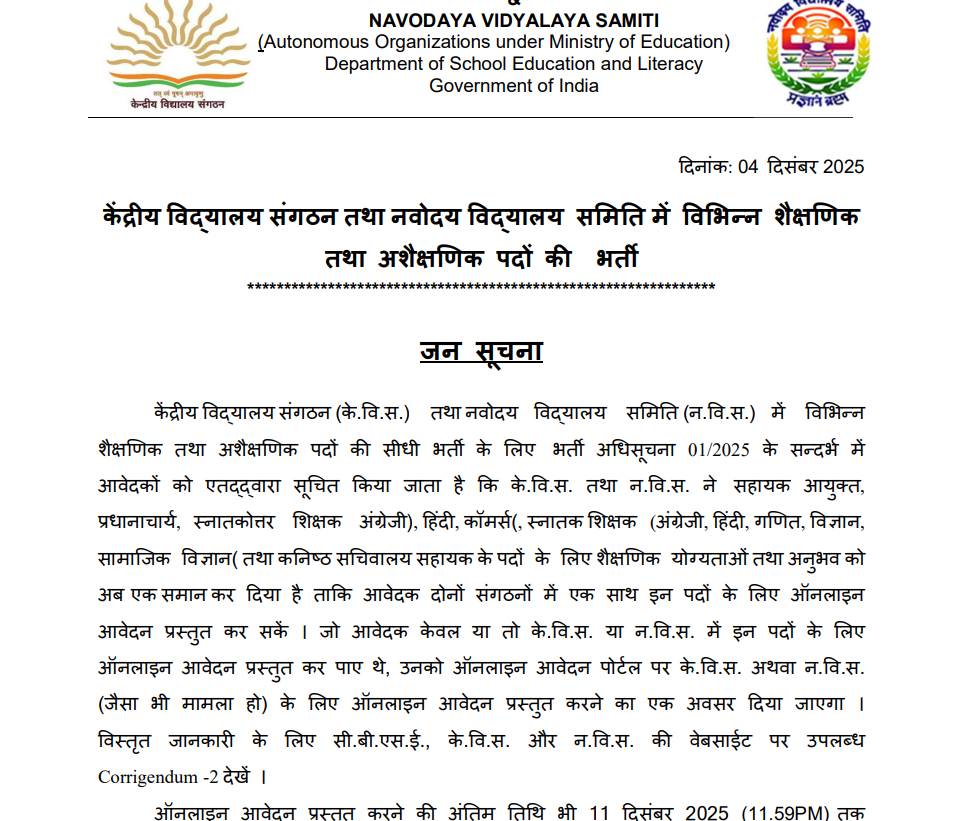 KVS और NVS भर्ती 2025 के लिए नया नोटिस जारी किया गया है। अब आवेदन की अंतिम तिथि बढ़ाकर 11 December 2025 कर दी गई है। यह बदलाव उन उम्मीदवारों के लिए बहुत फायदेमंद है जो पहले आवेदन नहीं कर पाए थे या जिन्होंने केवल एक विभाग (KVS/NVS) में आवेदन किया था। KVS / NVS Recruitment 2025