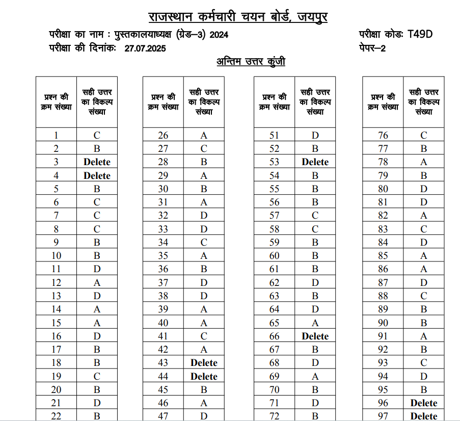 यह Final Answer Key 27 जुलाई 2025 को आयोजित परीक्षा (Paper–I & Paper–II) के सभी Delete Questions और Corrected Answers को शामिल करते हुए जारी की गई है। Library Grade 3 Recruitment 2024