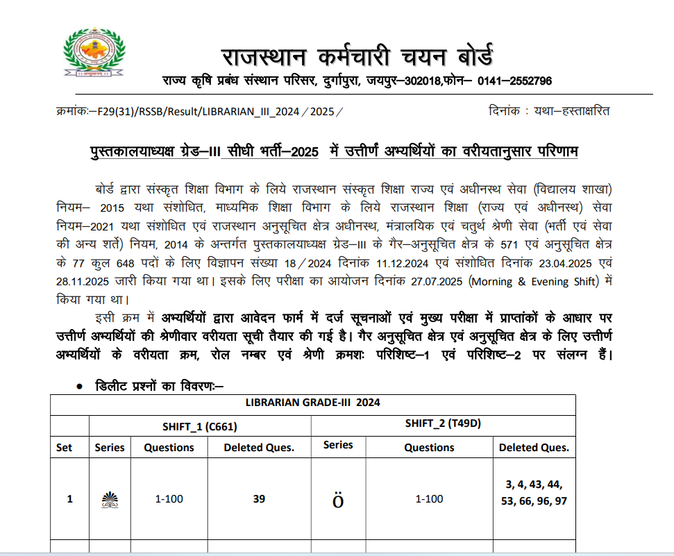 Rajasthan Staff Selection Board ने Librarian Grade-III भर्ती 2025 का Result व Cut-Off जारी कर दिया है। जिन्होंने परीक्षा दी थी, वे अब अपना Result, Marks, Category-wise Cut-Off और Scrutiny Form की जानकारी देख सकते हैं।RSMSSB Librarian Grade-III Result 2025